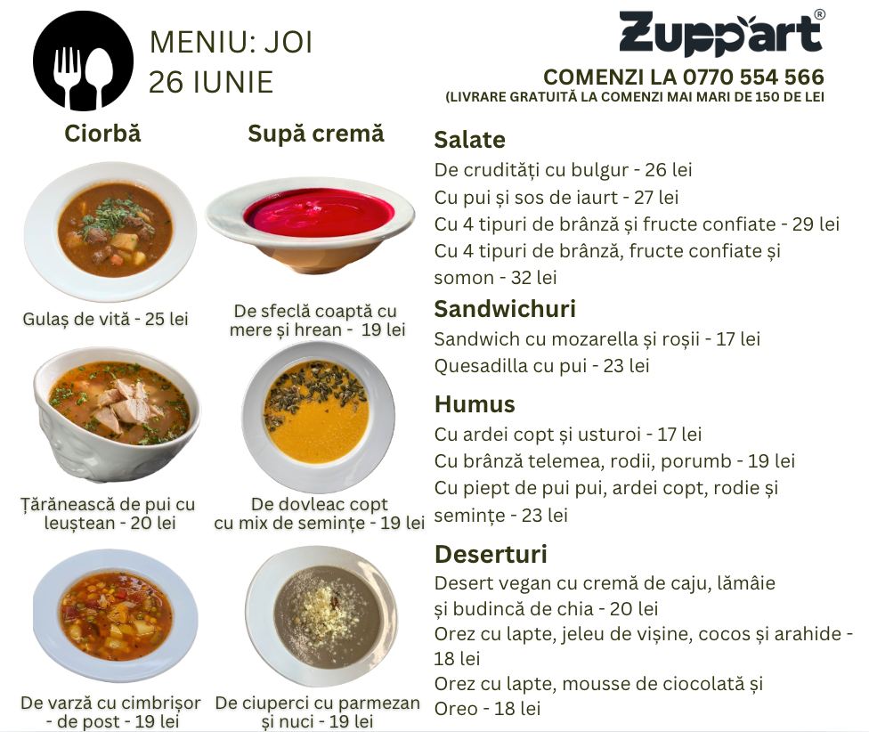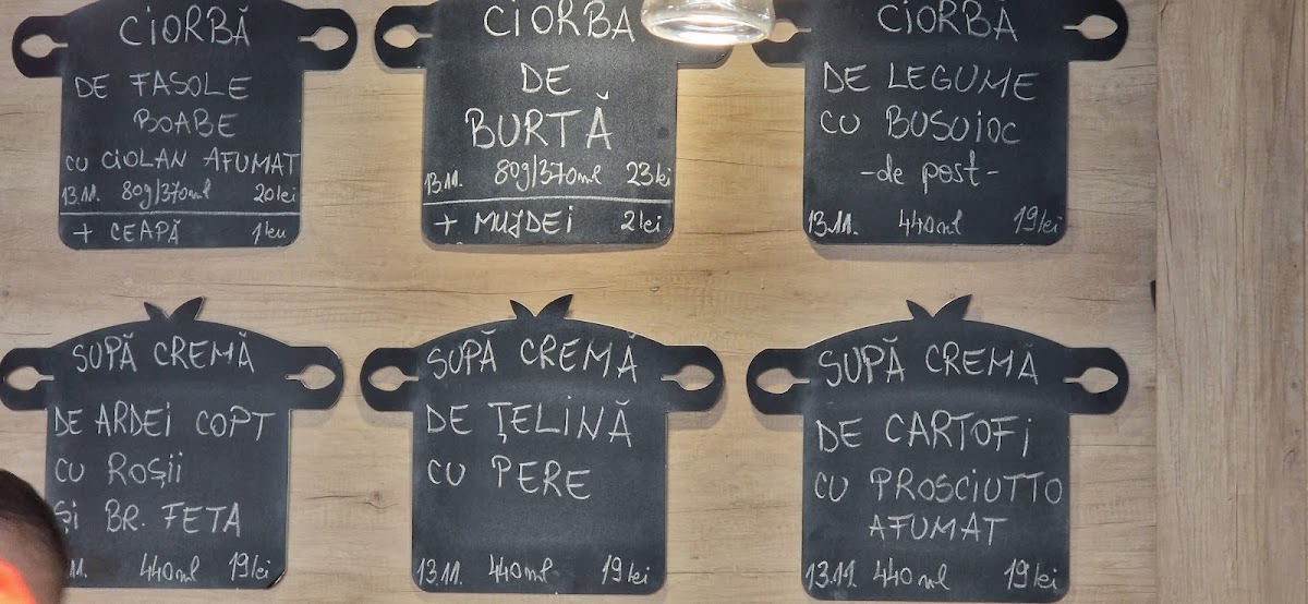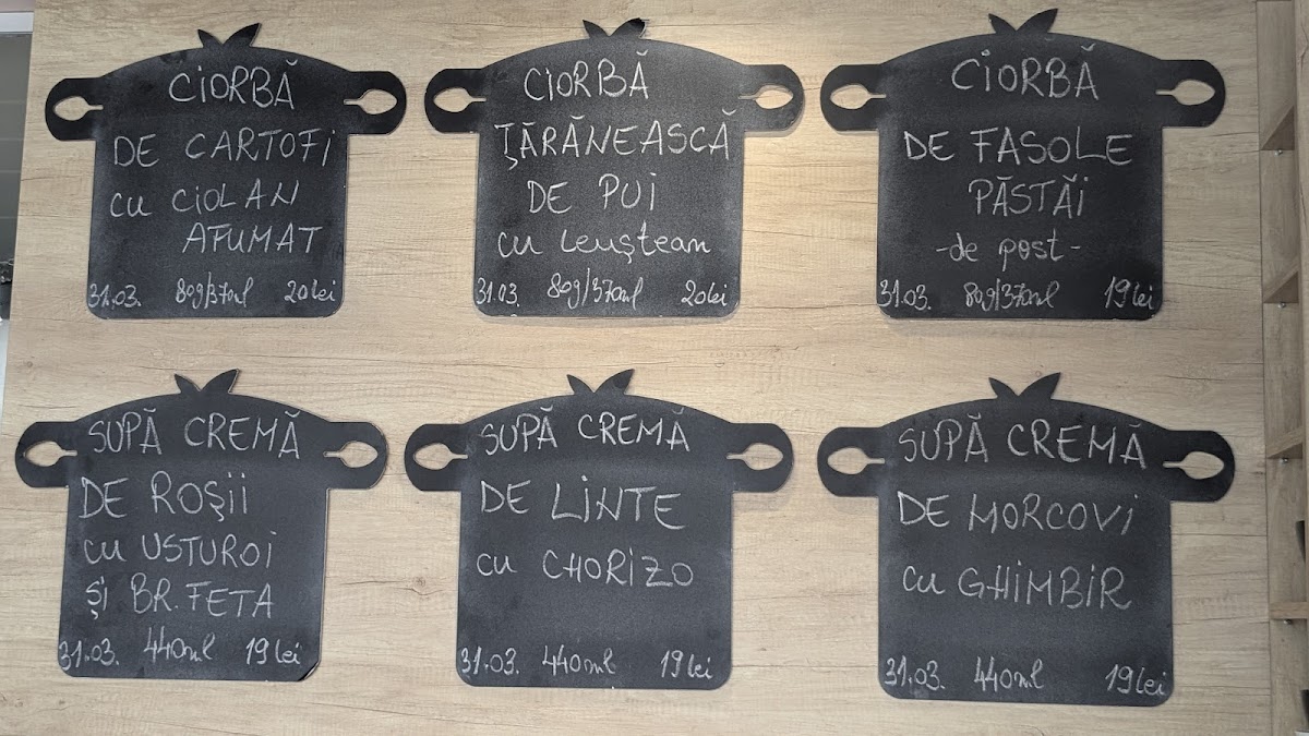 The menu features a variety of soups that range from traditional favorites like Ciorba De Fasole Cu Afumatura and Supă De Linte, to creative blends such as the Supa Crema De Rosii Cu Dovleac Hokkaido or the rich Gulaș De Vită. Alongside these, light dishes like the Chicken Quesadilla and Quinoa Bowl provide satisfying options that complement the soup offerings.