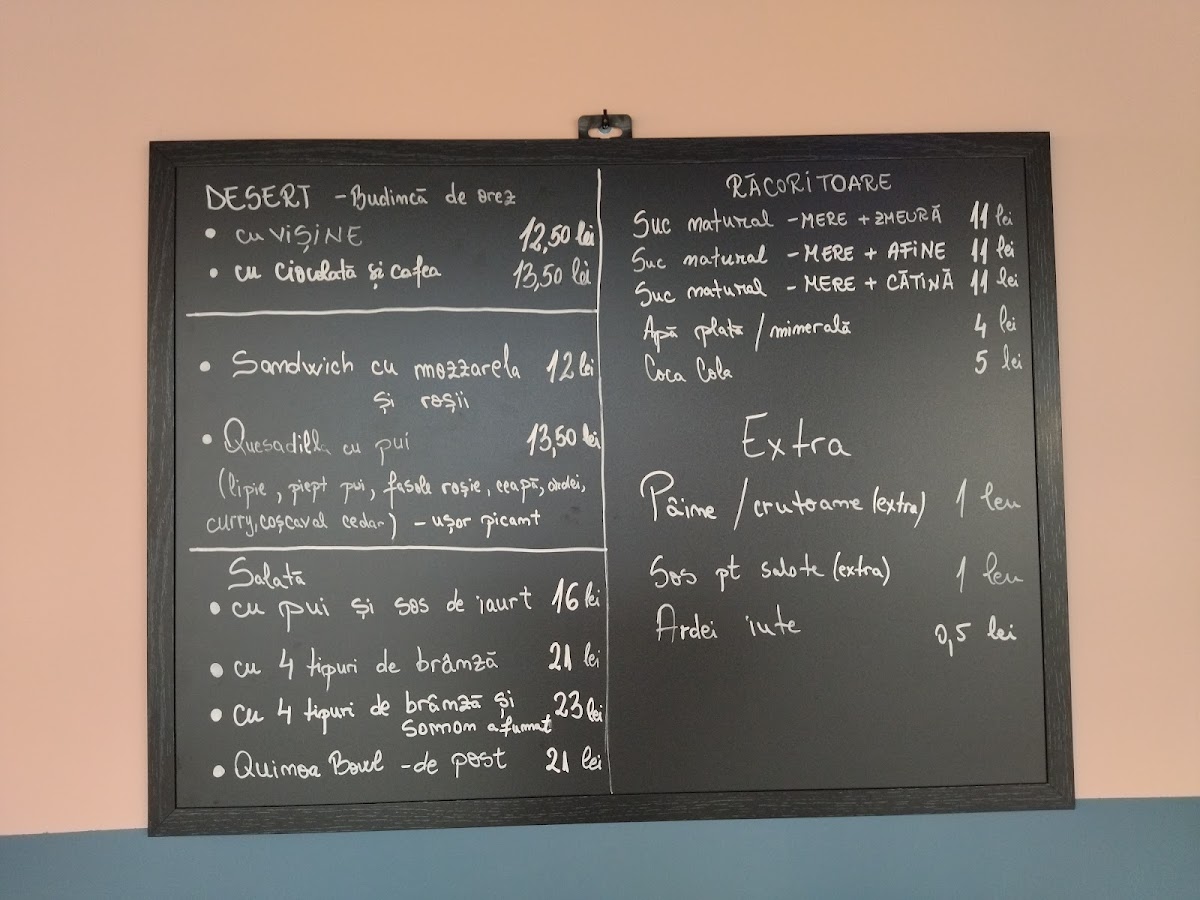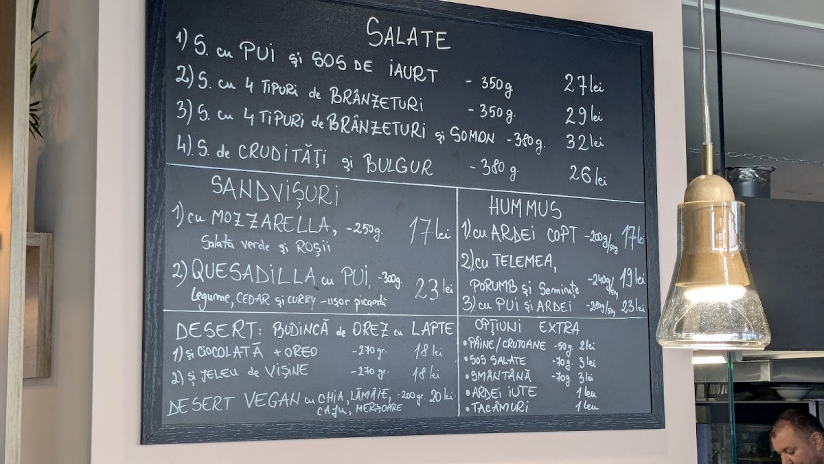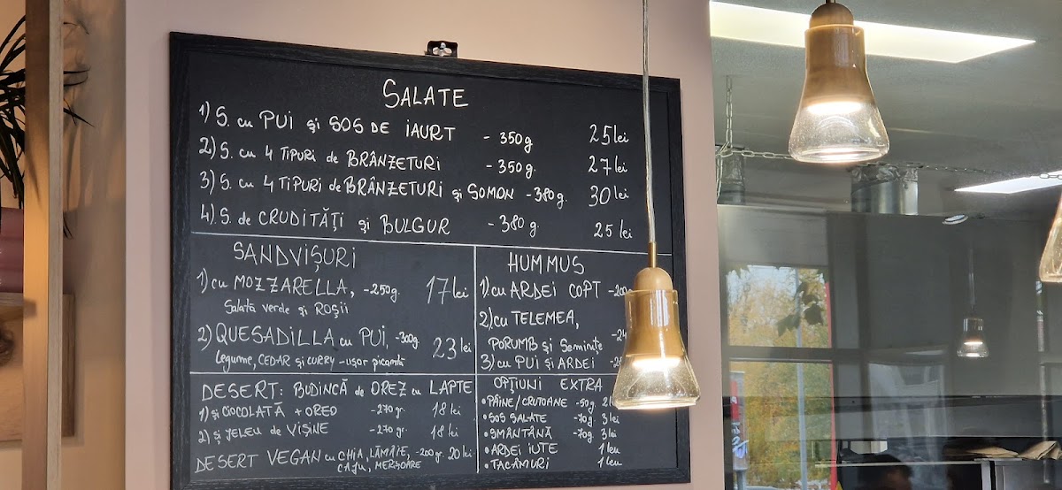Accompanying the main choices, guests can enjoy fresh salads, hearty spreads like Humus Cu Telemea Rodii Și Porumb, and thoughtfully prepared desserts including Desert Vegan Fără Zahar and Desert Orez Cu Vișine. This balance ensures there’s something to match a variety of moods and meal preferences, all within a setting focused on comfort and quality.
